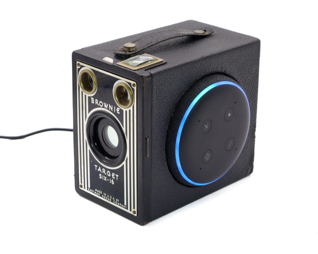 Enhance your home's ambiance with this captivating fusion of vintage charm and modern technology. Elevate your Amazon Echo Dot's presence with our Vintage Kodak Brownie Target Six-16 Camera Upcycled Echo Dot Holder. Order yours today and bring a piece of history into your contemporary living space!