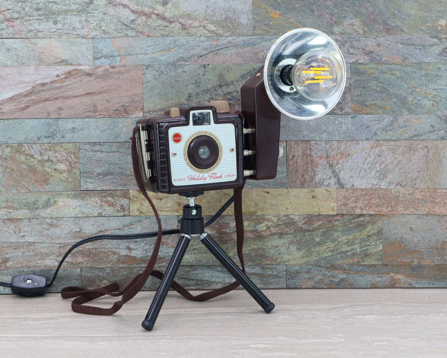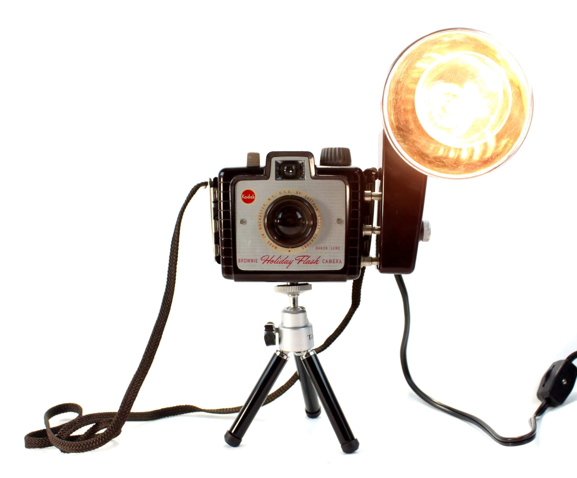 Vintage 1950's Brownie Holiday Flash Camera Lamp by LightAndTimeArt – a captivating blend of history, craftsmanship, and nostalgia, brought to life in the form of a one-of-a-kind lamp on a mini tripod. This remarkable creation pays homage to the golden era of vintage photography while illuminating your space with a warm and inviting glow.