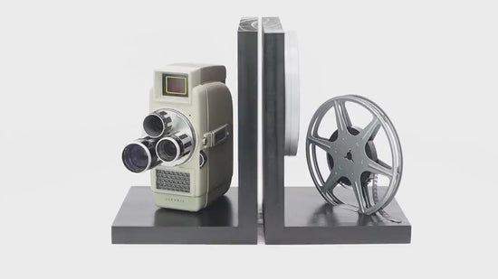 Original Sekonic 8 Triple Turret 8mm Camera, film and reel β designed into a pair of beautiful bookends.