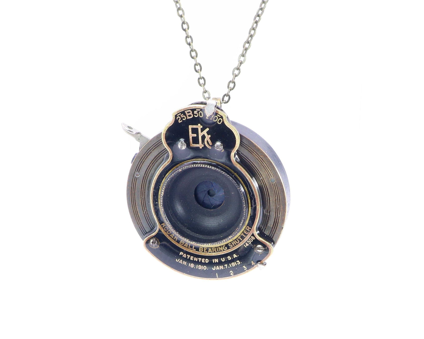 These are not photos of a camera lenses - the pendant is made from an original vintage Kodak Folding Camera.