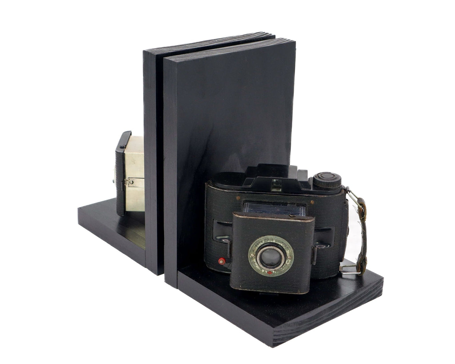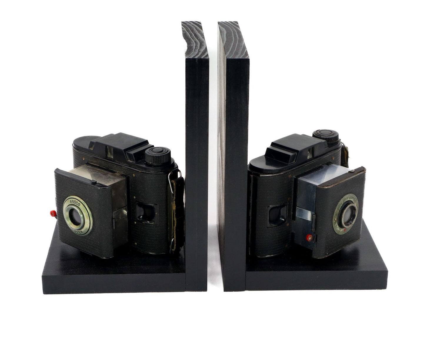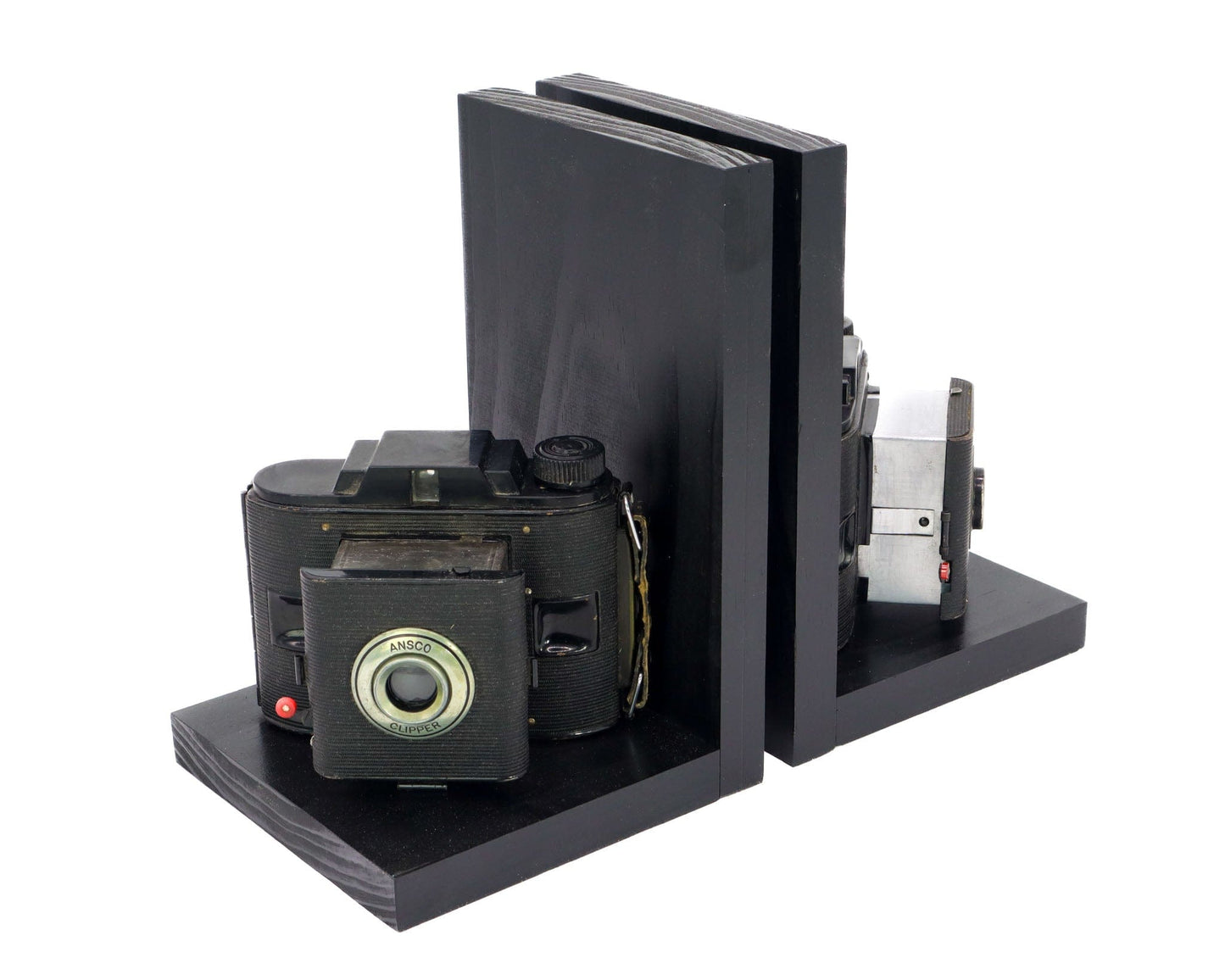 Vintage Revival: Handmade Wooden Bookends Crafted from Original Ansco Clipper Cameras