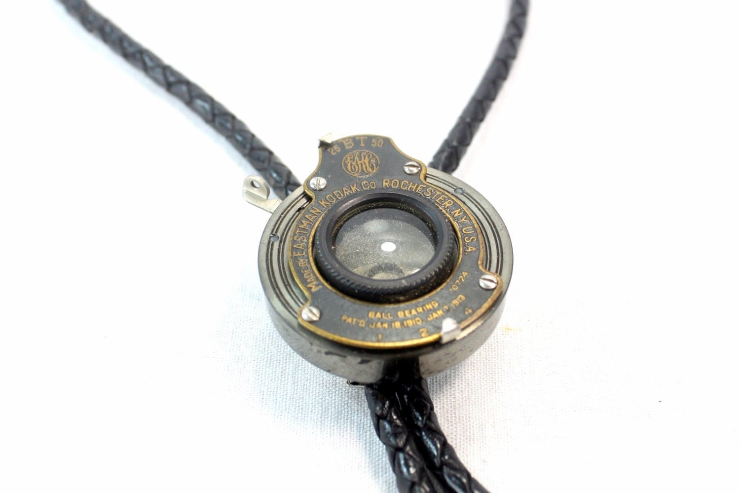 The bolo tie is using the lens of the folding camera as the center piece.