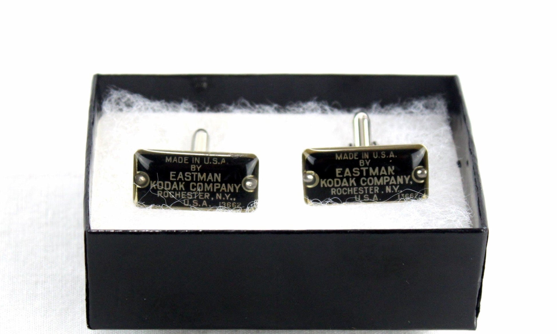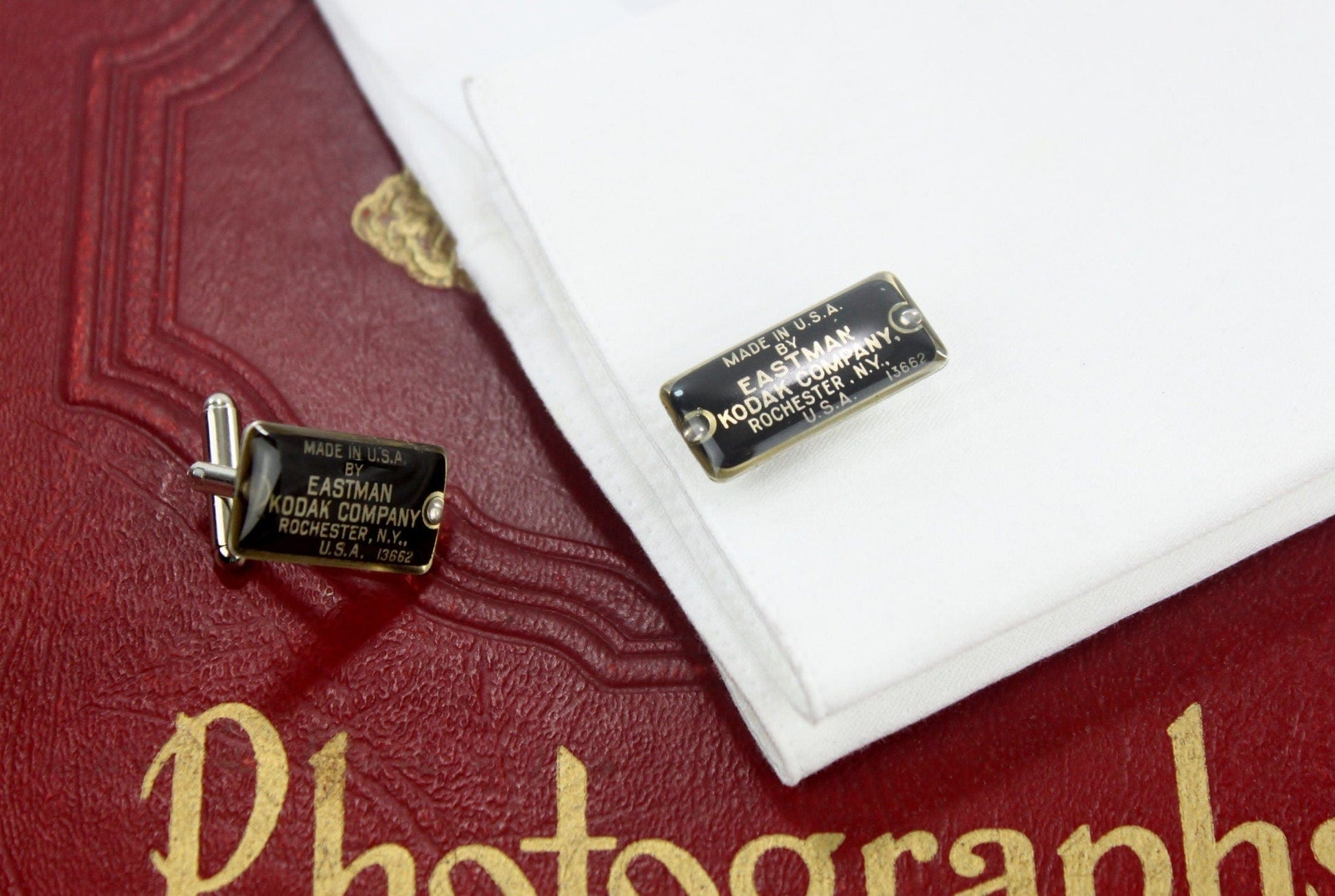 The cuff links are based on 2 folding camera Kodak name plates.