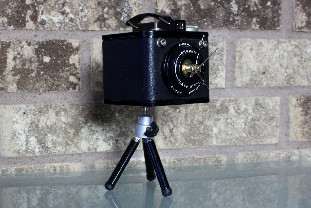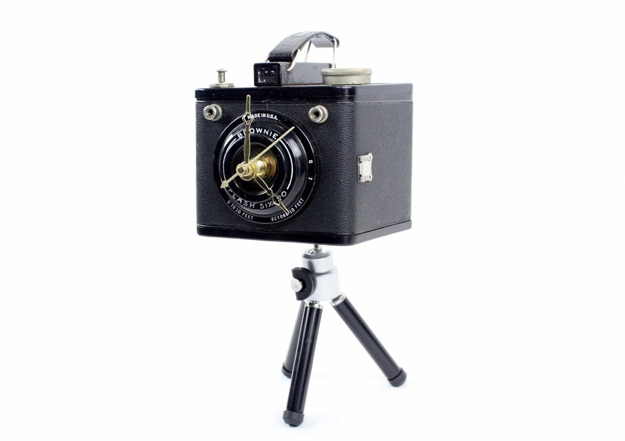 Vintage Tripod Desk Clock - Brownie Flash Six-20/16 Golden Hands - Repurposed Vintage Camera