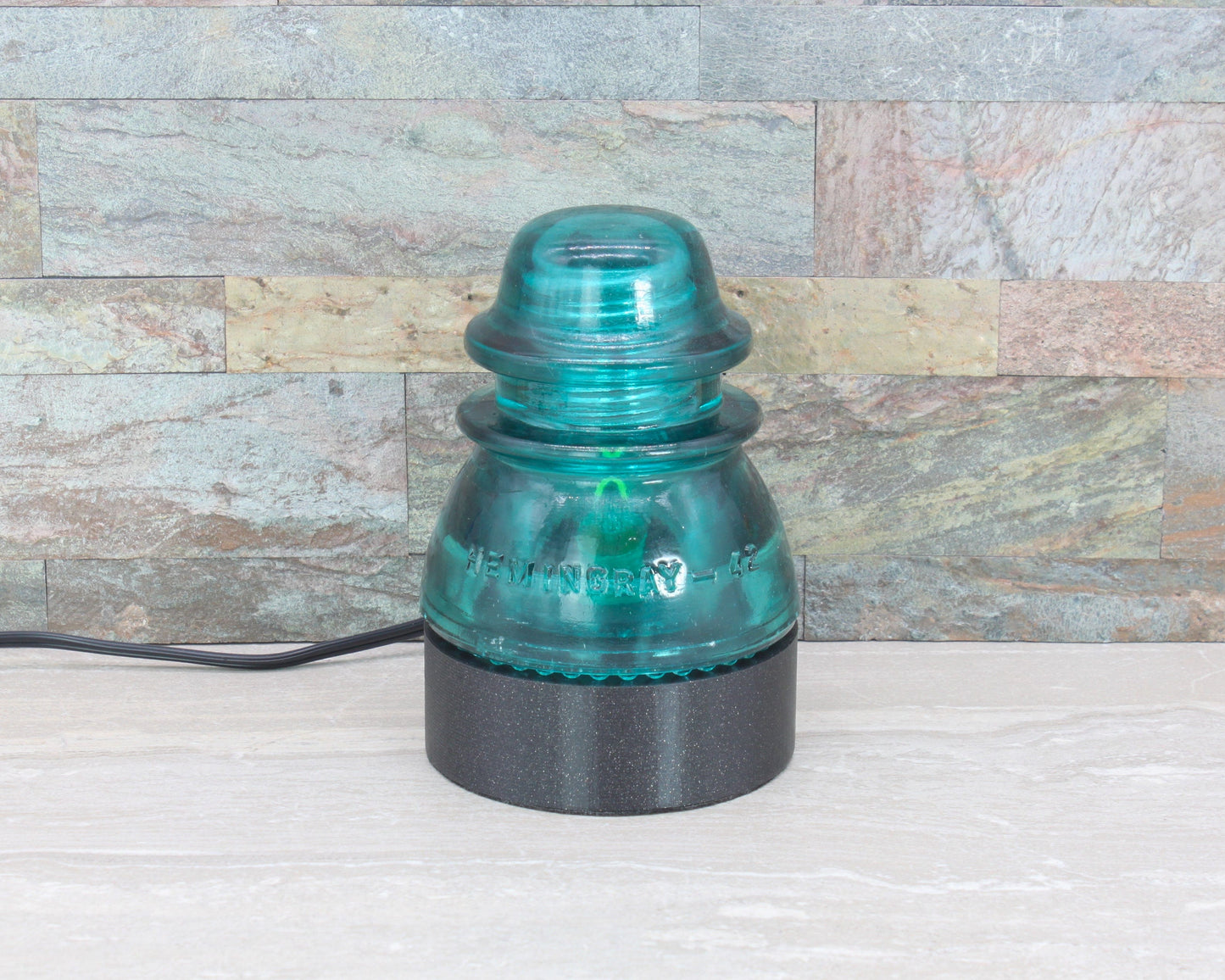 The "Big Green Lantern", attractive, contemporary table lamp consist of a PLA (plastic) base and a beautiful aqua Hemingray-42 glass insulator.