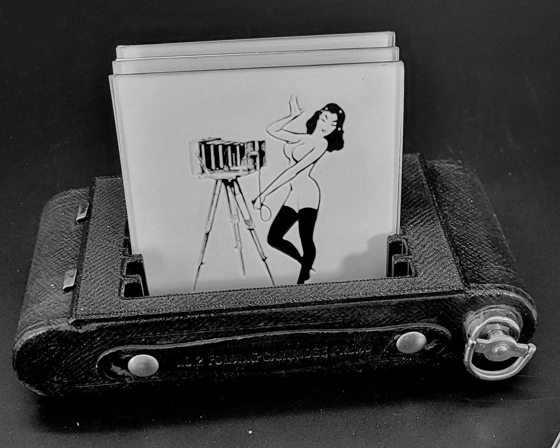 An original Kodak No 2 Brownie Folding Camera base has been converted into a unique, and attractive drink coaster holder / storage.