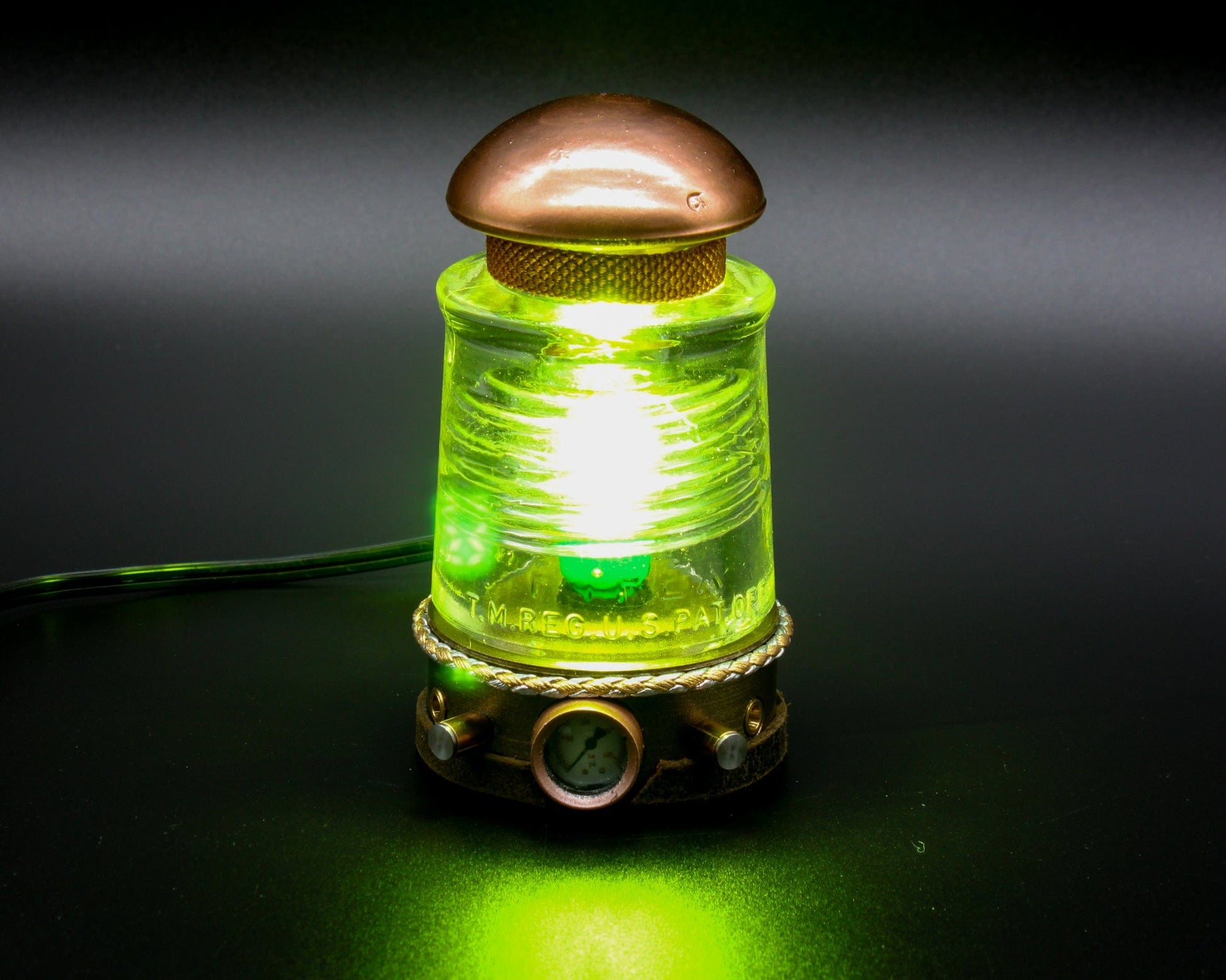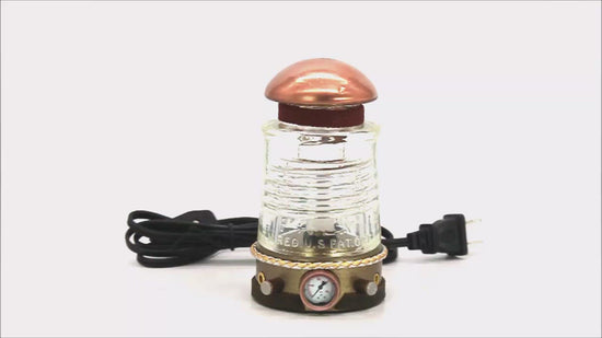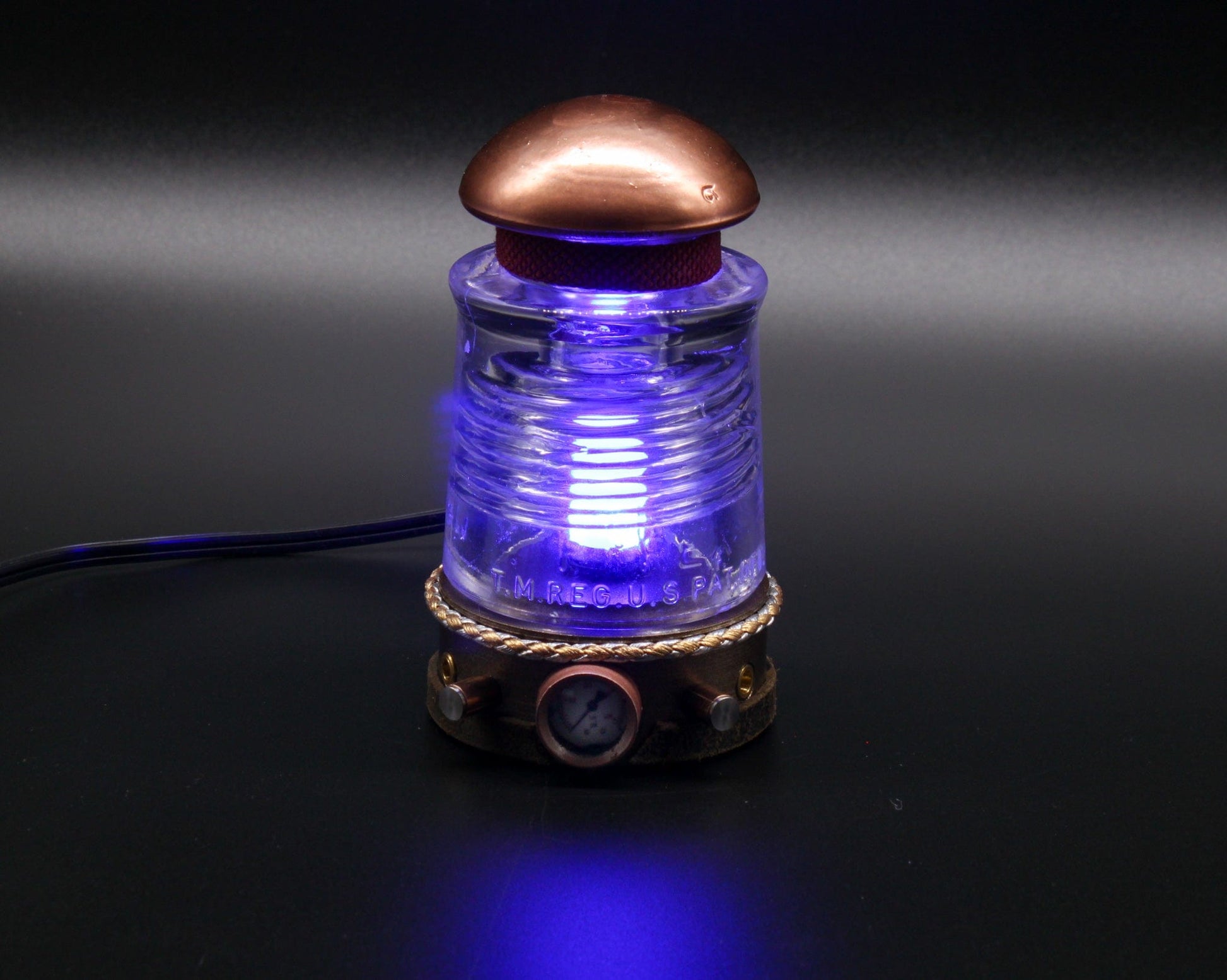 Steampunk Glass Insulator Lamp, Aluminum Base, PYREX C17, Industrial Lighting, Man Cave Deco, Neo Victorian Lamp design, Cyberpunk Lamp