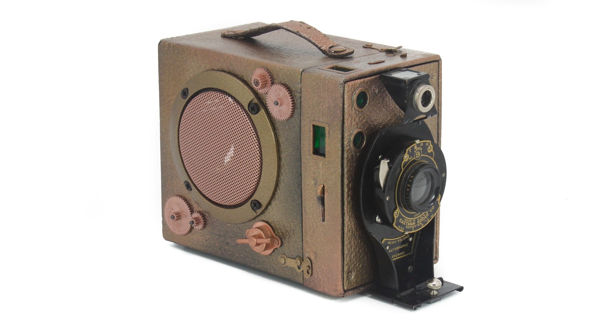 If you like techno and steampunk design – this intriguing, one-of-a-kind piece is for you. Vintage Kodak Box and Folding Camera parts upcycled and transformed into a unique looking holder/stands for Amazon Echo Dot 3rd Generation Speaker.