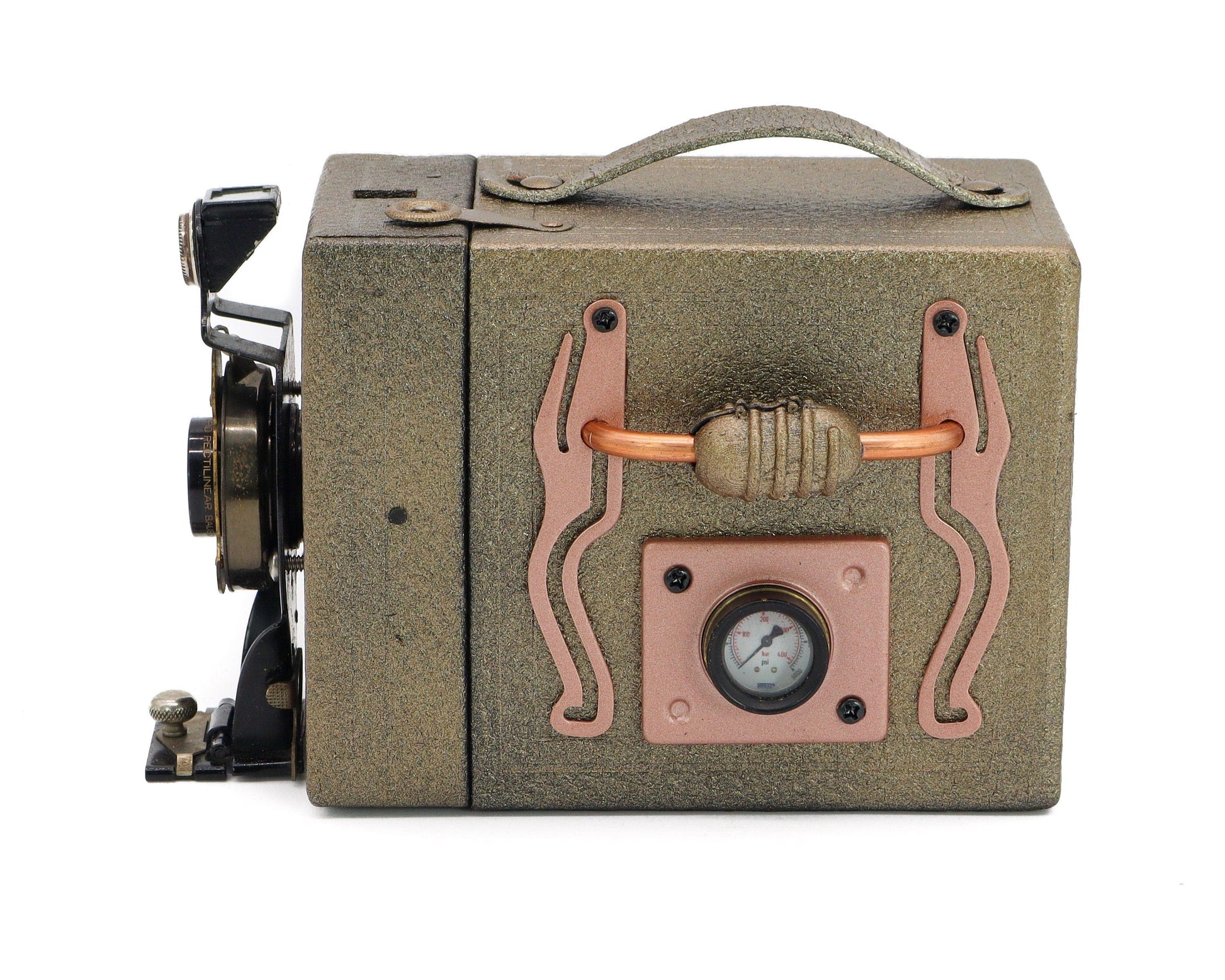 The “Heliopho Sound Box” © – a Steampunk Wireless Bluetooth Speaker upcycled from vintage Kodak box and folding camera parts. Designed and built by Steampunk Engineer Manny from LightAndTimeArt.