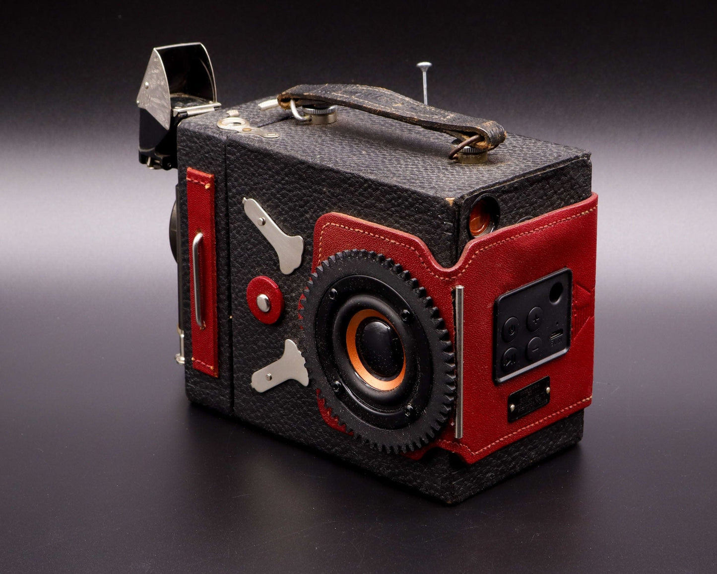 Eccentric Eco-Friendly Gift: "The Red Baron VI" is not just a speaker; it's a work of art and innovation. Crafted from upcycled vintage Kodak box and folding camera parts, it's the perfect gift for those who appreciate both history and technology. Whether you're a steampunk enthusiast or simply someone who enjoys distinctive, eco-friendly gadgets, this speaker is a must-have addition to your collection.