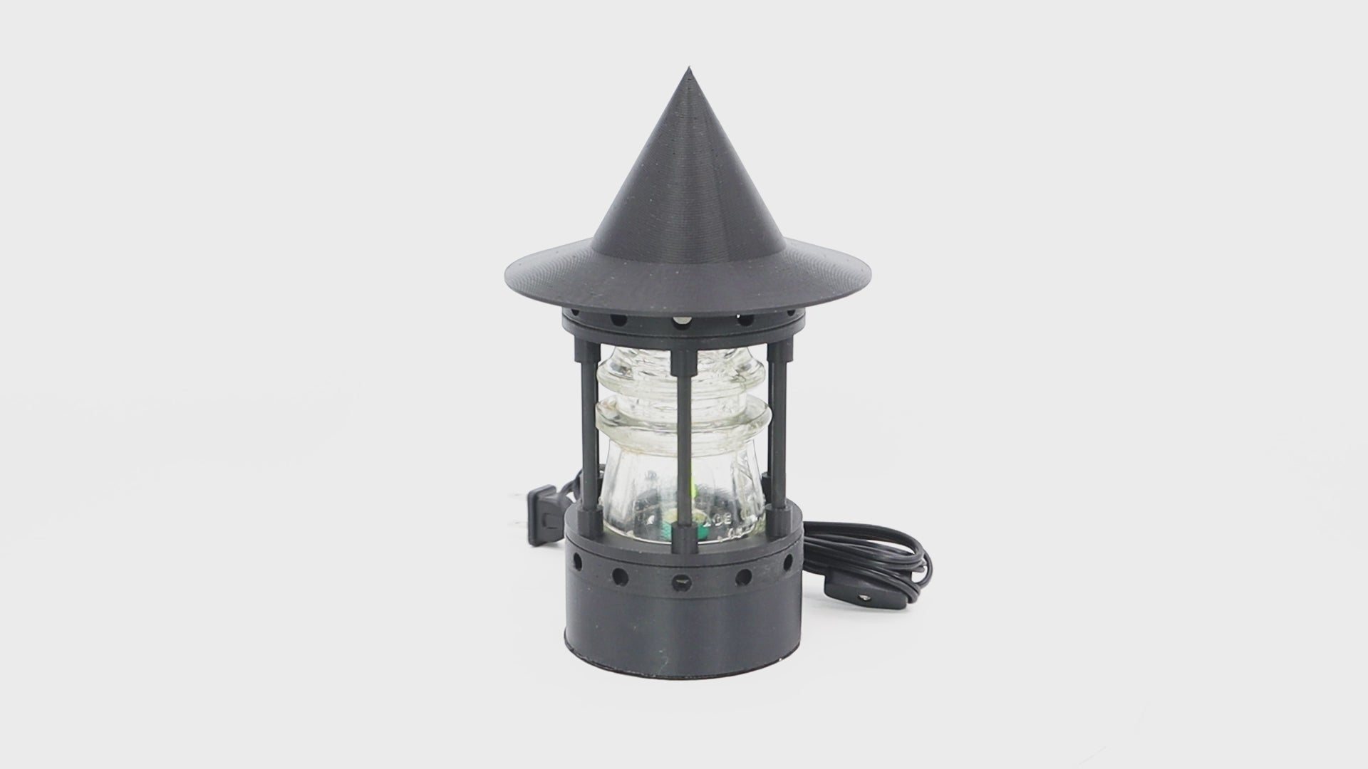 "The Witch Tower", an attractive, contemporary custom table lamp consist of a lamp base, an open lamp enclosure and a beautiful clear Hemingray vintage glass insulator.