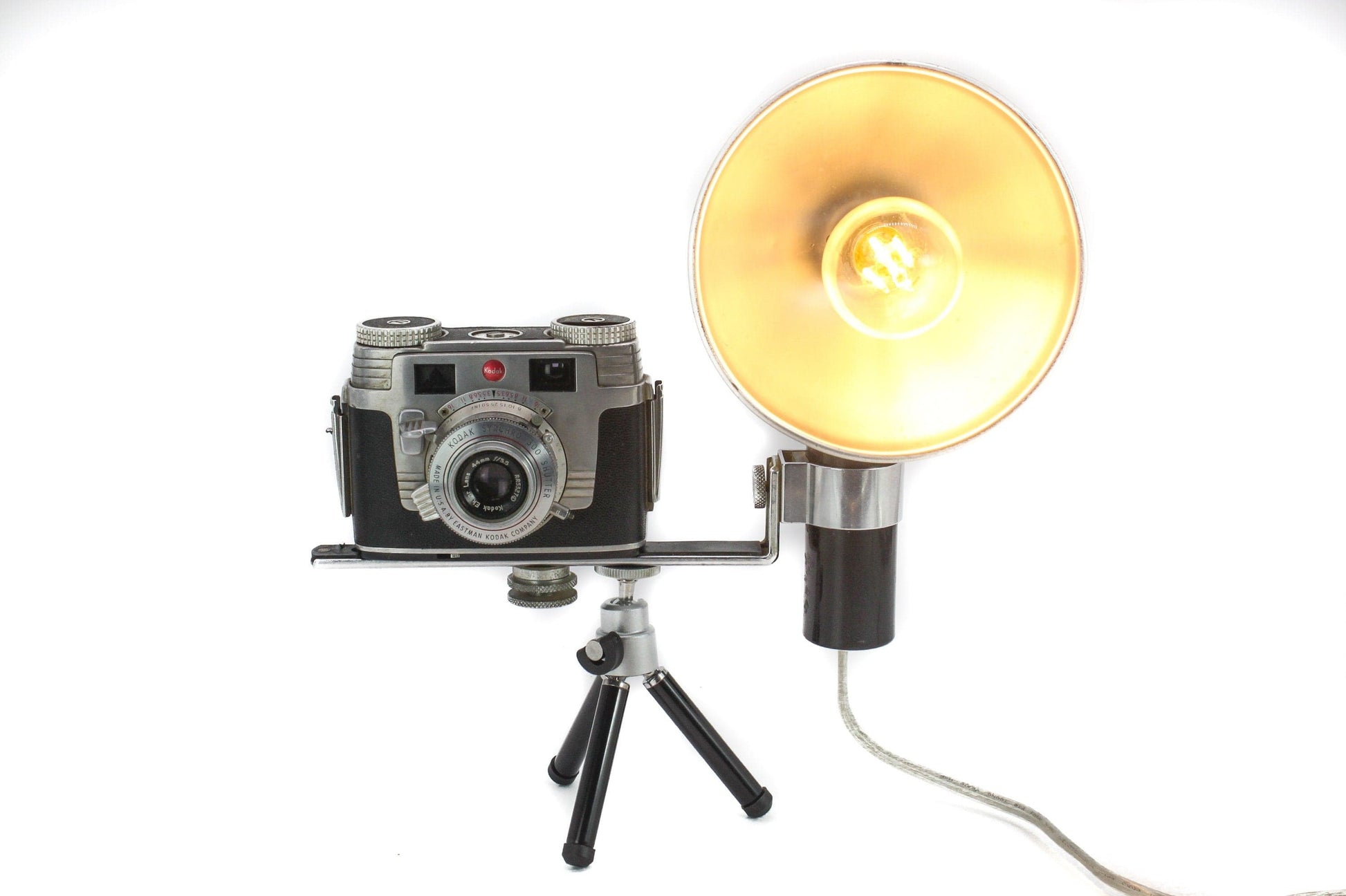 Authentic Kodak Signet 35 Camera: This lamp features a genuine Kodak Signet 35 camera, a symbol of quality craftsmanship from the mid-20th century. The camera body, painstakingly restored to its former glory, boasts a gleaming silver finish that exudes elegance and authenticity. It's a true collector's piece that doubles as functional art.